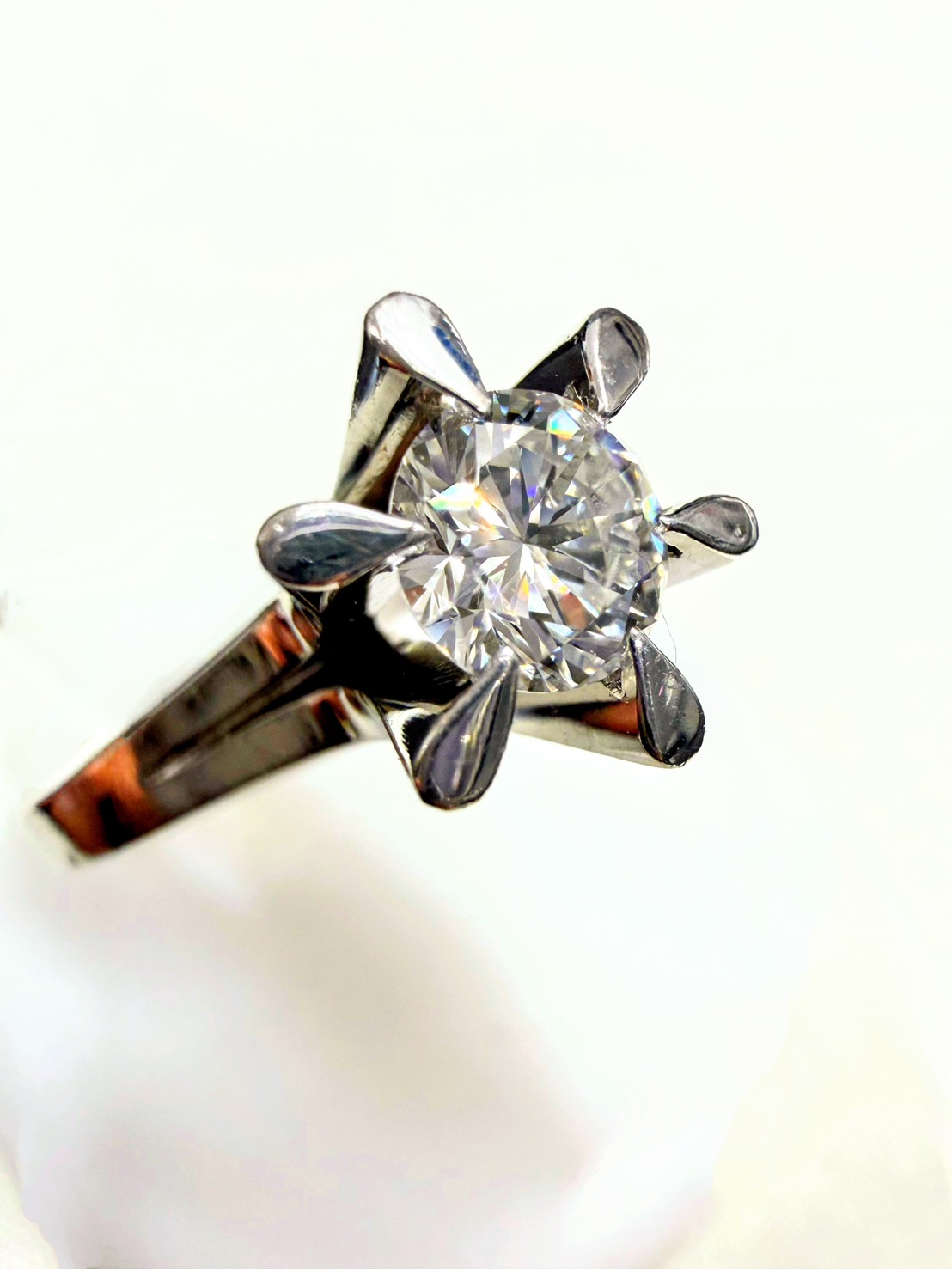 圧倒的な存在感を放つ、大粒のダイヤモンドをあしらったプラチナリングをお買取りいたしました。 昔ながらの立て爪デザイン(ソリティア)は、ダイヤモンドに光を最大限取り込み、その輝きを最も引き立てる気品あるスタイルです。4C(カット、カラー、クラリティ、カラット)の各要素を詳細に鑑定し、地金のプラチナ相場に宝石としての価値を上乗せした最高水準の価格で成約いたしました。