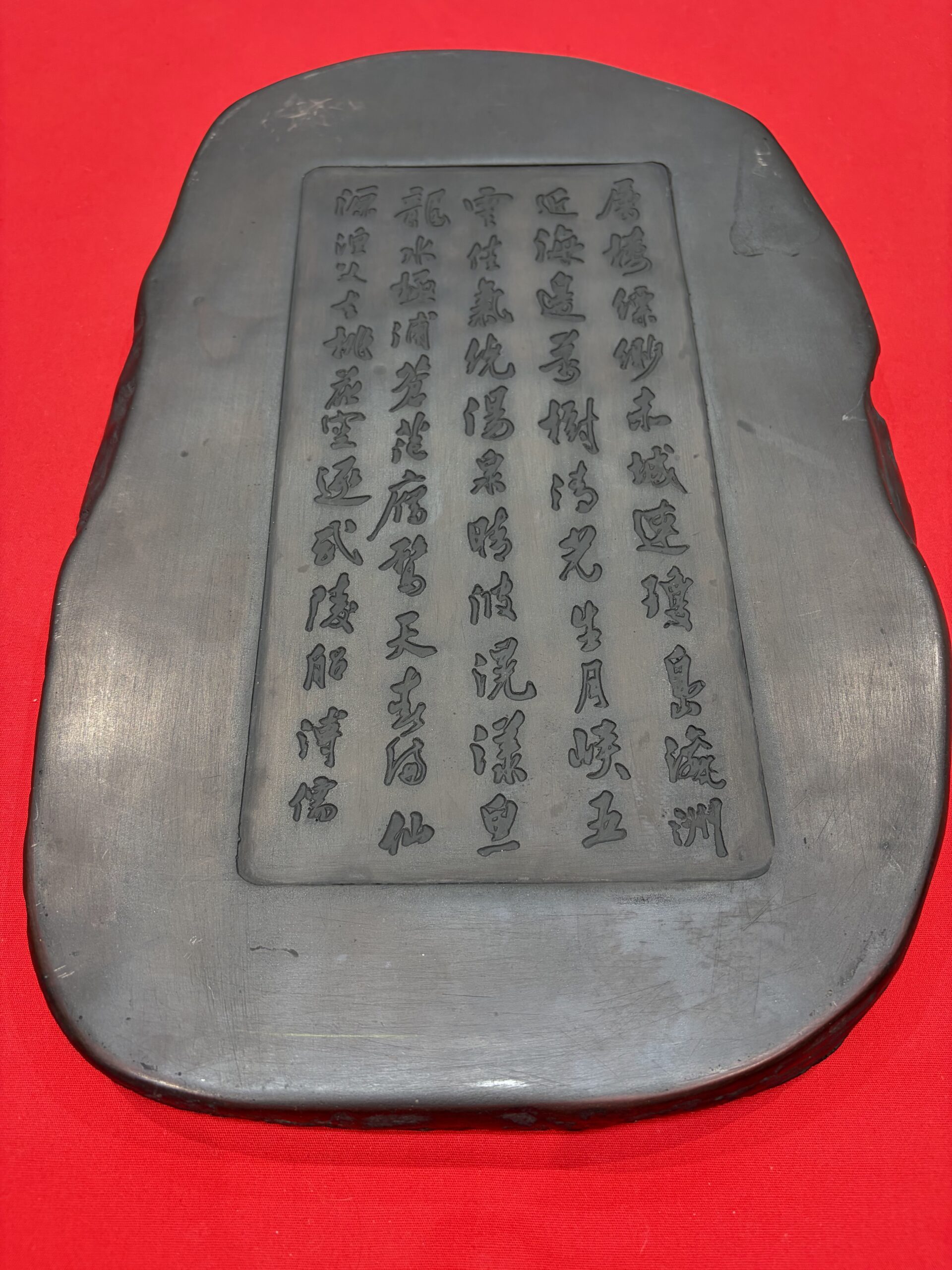 背面に緻密な漢詩の彫刻が施された、芸術性の高い「端渓硯」をお買取りいたしました。 優れた石質だけでなく、一字一字丁寧に刻まれた書体の美しさが際立つ逸品です。端渓硯の中でも、こうした装飾や彫刻があるものはコレクターの方からの需要も非常に高く、歴史的・美術的価値を最大限に考慮して高価査定させていただきました。